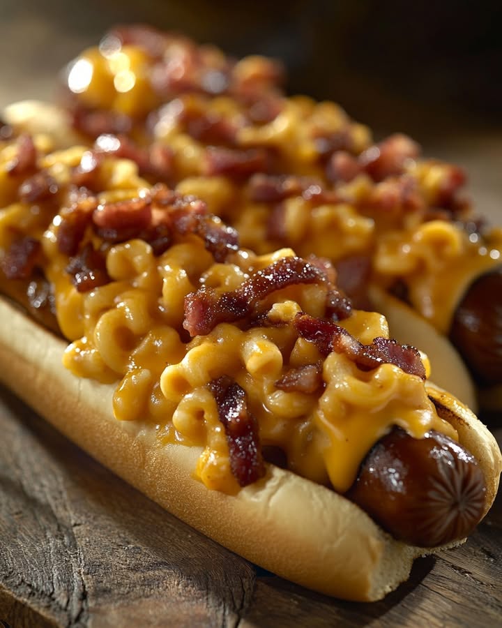 - Assemble the dogs by placing each hot dog in a bun, topping with the beef and bacon mixture, and adding macaroni and cheese.